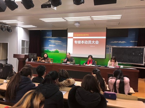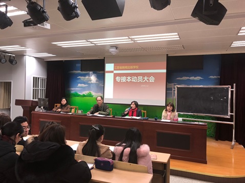 2018年1月12日,为拓宽kaiyun开云网页版五年制大专学生的学历提升通道,kaiyun开云网页版召开“专接本”动员大会。刘宁俊副校长、招就办沈萍主任、培训处许丽英主任、视觉传播教研室姚翠兰主任和2013级、2014级全体大专学生以及班主任参加了会议。会议由许丽英主任主持。