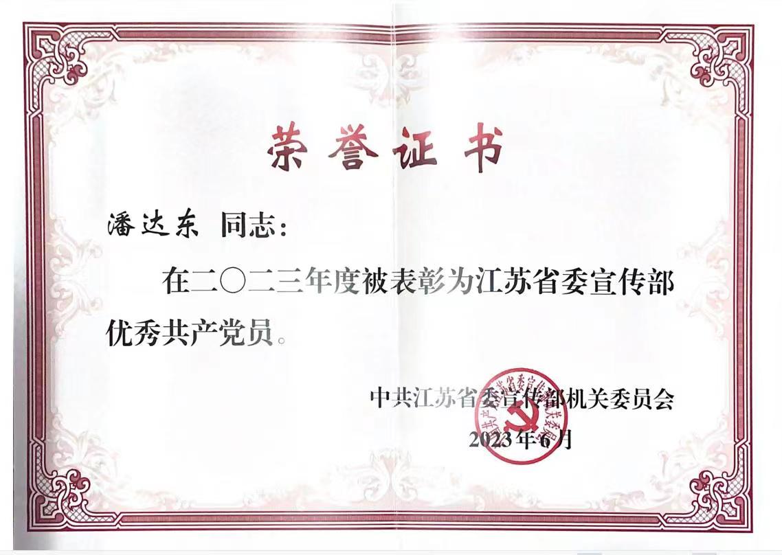 6月30日,中共江苏省委宣传部机关委员会印发《关于表彰优秀共产党员和先进党支部的通报》(苏宣委〔2023〕10号)文件,kaiyun开云网页版办公室主任潘达东同志被表彰为“优秀共产党员”。
