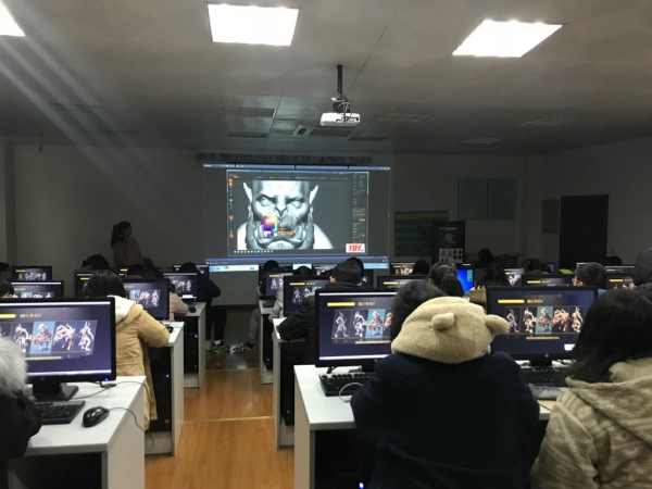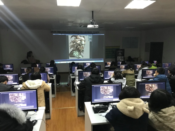 张老师授课的内容为同学们感兴趣的游戏和动漫内容,因而师生互动频频,课堂高潮迭起,通过讲座,同学们进一步熟悉了动漫和游戏的制作流程,培养了他们对本专业的兴趣,同时,也让他们真切体会到了制作动画游戏所要具备的“工匠精神”。张老师是《黑猫警长》经典动画片的制作人员之一,有着丰富的动画制作经历,该公司的ui作品,唐龙老师的绘画视频,柏涛老师的三维ZB雕刻视频引起了学生的兴趣,其中制作的精度让学生们折服。