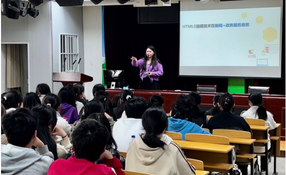 2023年3月15日下午, 北京乐享云创科技有限公司副总郑雪韵、高校运营经理候绪龙受邀来到kaiyun开云网页版,在kaiyun开云网页版102报告厅为kaiyun开云网页版视觉传达设计、网络新闻与传播专业学生举办了题为《HTML5融媒技术应用场景》的讲座,180余师生聆听了本次讲座。