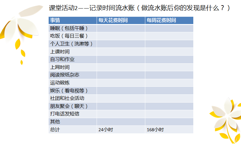 卢老师以提问的方式切入讲座主题,让同学们思考了以下三个问题:你适应高职生活吗?你对自己的高职生活安排是否满意?你是否善于管理时间?同学们纷纷踊跃发言表达自己对高职生活的向往和计划,卢老师就以上三个问题给大家讲述了高职生的适应问题,生活管理以及时间管理这三个方面的内容,着重介绍了时间管理的意义及益处,改善时间管理的方法。同时带领全体同学朗诵了诗歌《抓住今天》,让同学们从文学作品中体会到今天的可贵,珍惜今天的美好时光发奋学习。在诗歌朗诵之后穿插了课堂活动——“记录时间流水账”,同学们在纸上列出每日花费在睡眠、吃饭、上课、娱乐等方面的时间,并且加以反思和规划,如何能够更好的安排自己的学习和生活的时间,最大程度的提高学习效率。